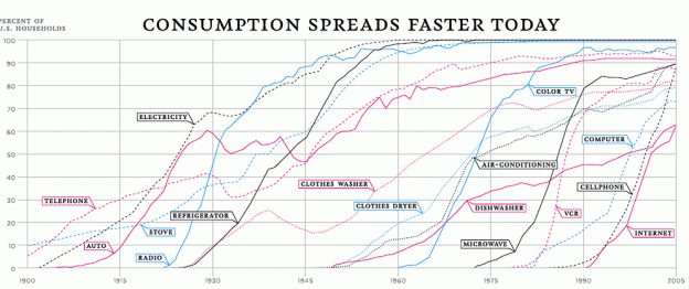 One might interpret the upper graph as showing accelerating adoption rates. But I interpret the lower chart as illustrating at least two factors that drive diffusion: the relative importance of network infrastructure and the expense relative to individual wealth. Autos, telephones and electricity all required construction of a large network of roads or wires, often funded with public investment. Individuals can’t choose to adopt the technology until a larger public decision is made to facilitate that adoption. As to expense, refrigerators and dishwashers were large household investments for many years, and cars are still a large single expenditure. On the other hand, cell phones, radios and televisions quickly became inexpensive which lubricated diffusion. We need another graphic showing how diffusion rates relate to these two different axes.
